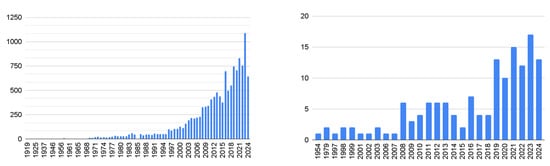 Out of the 12,488 results of “mass timber” articles from the preliminary literature search, 59% of these studies were published in the last ten years, with 38% appearing in just the past five years, highlighting the growing research interest in mass timber along with the rise of the industry (growth as shown on Figure 3 left). It can be seen that since the invention of CLT and Glue Laminated Timber (Glulam, GLT) in the 1990s [25], research into mass timber has surged, with a significant increase in the past decade.