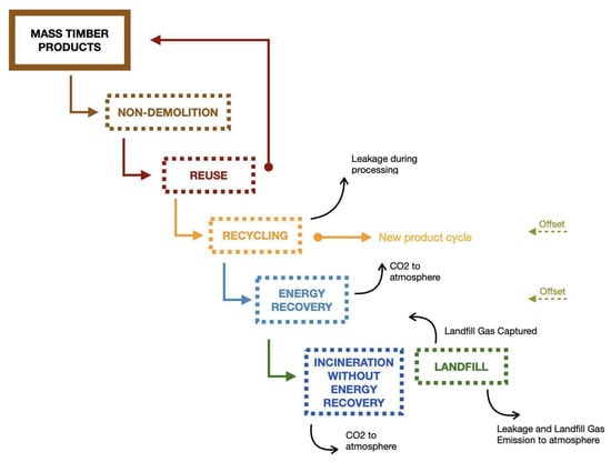 Based on the cascading principle and the hierarchy of circular strategies outlined in Section 1 Introduction [3,4], recovering mass timber materials for reuse is the second priority after the adaptive reuse of the entire mass timber structure. When it is no longer possible to reuse mass timber materials for the same purpose, recycling becomes the next preferred EoL scenario in the cascading hierarchy. If both reuse and recycling options are fully exhausted, energy recovery can be selected to offset GHG emissions in the next system. Finally, landfill should only be considered as a last resort due to its potential negative environmental impacts.