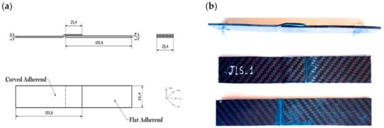 The adherends were bonded using a joggled lap shear (JLS) configuration. The adhesive was applied in accordance with the supplier’s recommendations, ensuring a uniform bondline thickness of 0.76 mm using appropriate fixtures. The adhesive was cured at a temperature of 65 °C for 1 h, followed by a post-curing interval of 5 days prior to testing. Figure 1 illustrates the JLS bonded laminates, providing both top and side views of the specimens, along with a geometrical sketch of the sample.