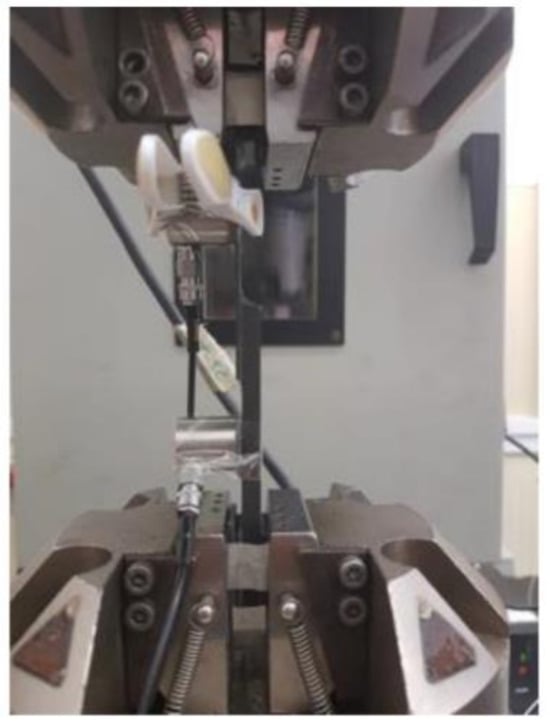 Three specimens, designated JLS1, JLS2, and JLS3, were tested under identical conditions. All specimens were subjected to tensile loading in an INSTRON servo-hydraulic testing machine with a load capacity of 100 kN. To monitor damage evolution, acoustic emission signals were collected during testing. Two R30a AE sensors (Physical Acoustics, MISTRAS Group, Princeton Junction NJ, USA), with a sensitivity range of 150 kHz to 450 kHz and a resonant frequency of 300 kHz, were affixed to the bonded adherends at a distance of 40 mm from the specimen midpoint (see Figure 2 for the testing rig setup). The AE signals were preamplified by 40 dB using an AST 2/4/6 preamplifier. Waveform data were sampled at 1 MHz to satisfy the Nyquist criterion while minimizing data volume.