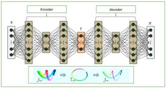 In Equation (1), is the activation function of the rectified linear unit (ReLu) that represents the nonlinear mapping between the input and the output , from the input layer to the fourth layer, with as the weight matrix and as the bias vector, respectively. The dimensionality of inputs decreases in proportion to the number of neurons in the bottleneck hidden layer, where the dominant features that represent information content in the input data are automatically extracted [45]. Subsequently, the decoder utilizes the bottleneck hidden layer to reconstruct the initial input through mapping by the activation function Relu .