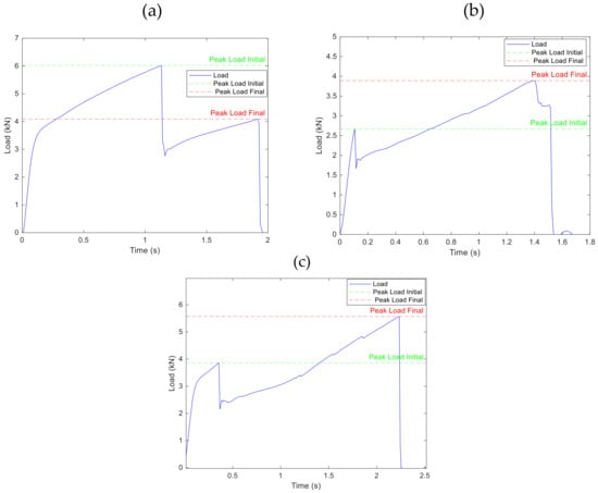 The mechanical characterization of the damage modes of JLS specimens was carried out through a series of tensile tests, following the recommendations of the ASTM D5868 standard [51]. Two critical points can be identified from the mechanical results presented in Figure 5: the maximum load at initial failure, which indicates the onset of damage, and the maximum load at final failure, which represents the complete failure of the specimen. Although the three specimens share similar material characteristics, their peak load values differ significantly. This finding has been observed by several authors on the bonded specimen, such as Avila et al., Liu et al., Adin et al., and Kadioglu et al. [52,53,54,55]. This variation can be attributed to a series of factors such as overlap length, adhesive thickness, and scarf angle.