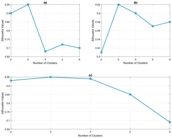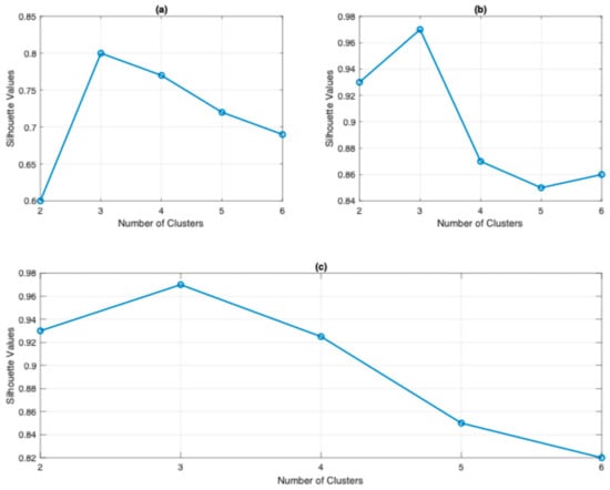 Silhouette values of clusters for latent features of (a) JSL1; (b) JLS 2; and (c) JLS3.