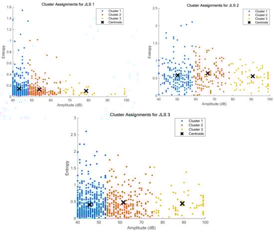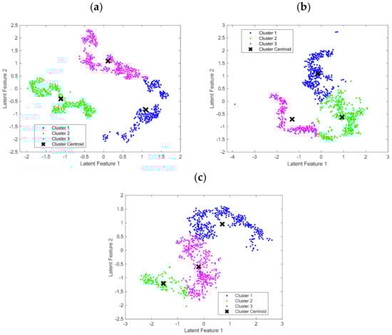 Latent features clustered by the k-means algorithm for (a) JLS 1, (b) 2, and (c) 3.