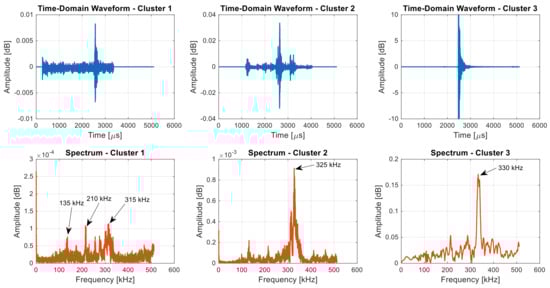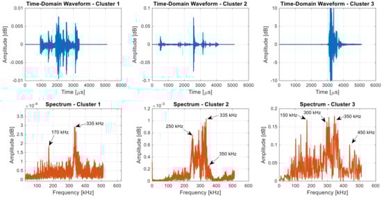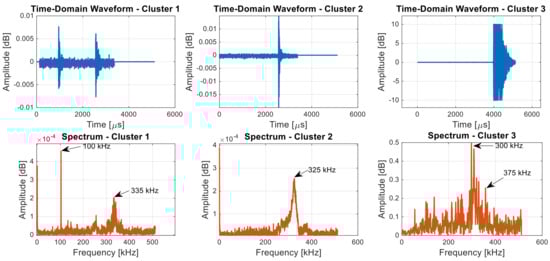 Recent studies have applied various forms of autoencoders, including deep convolutional, variational, and stacked autoencoders, for damage detection in different materials [64,65]. The methods have demonstrated improvements in the automated detection and classification of damage mechanisms. Despite these advances, the relationship between latent features and specific damage modes remains unexplored. This represents a significant gap that limits our understanding of damage mechanisms. To address this limitation, the model proposes analyzing the AE waveforms corresponding to the clustered data points. These analyses are carried out on the corresponding signals reconstructed by the decoder. Therefore, a frequency-domain analysis of the waveforms is performed using a fast Fourier transform. The objective is to accurately identify the frequency characteristics responsible for damage modes in bonded composite specimens.