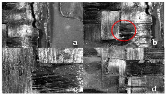 The Delamination along the boundary of the adhesive layer interface is observed in Figure 19b. The adhesive not only detached from the lamina but also triggered fiber/matrix debonding within the same layer. Figure 19c provides a magnified view of the circled region in Figure 19b.