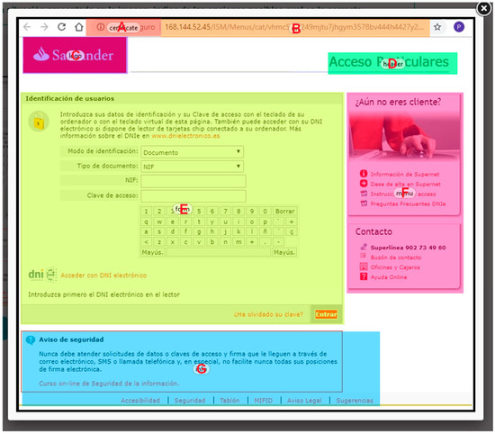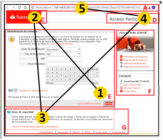 Design of Item24 showing an access page to an online bank in Spanish. The letters A–G correspond to the identifiers assigned to each defined area of interest.