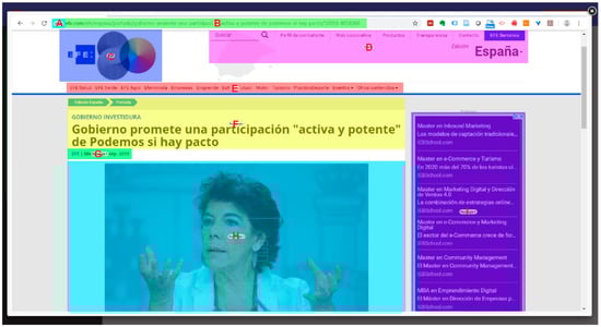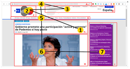 Design of Item32 showing a screenshot of a news article written in Spanish. The letters A–I correspond to the identifiers assigned to each defined area of interest.