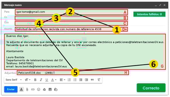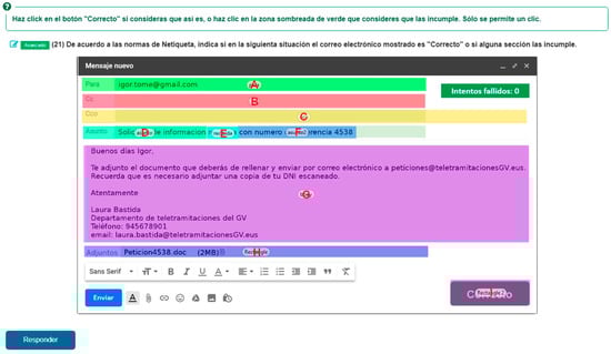 Design of Item4 showing a screenshot of an e-mail written in Spanish. The letters A–I correspond to the iden-tifiers assigned to each defined area of interest.