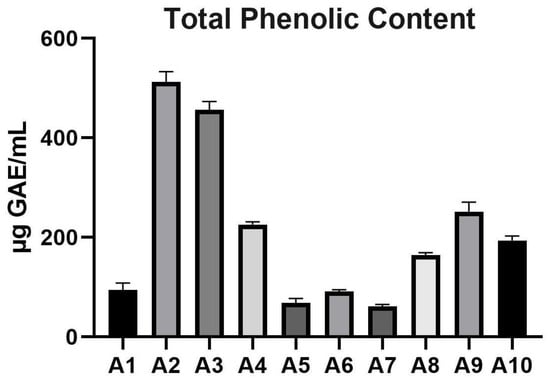 TPC of the analyzed Acer (A1–A10) samples. GAE: gallic acid equivalents; TPC: total phenolic content.