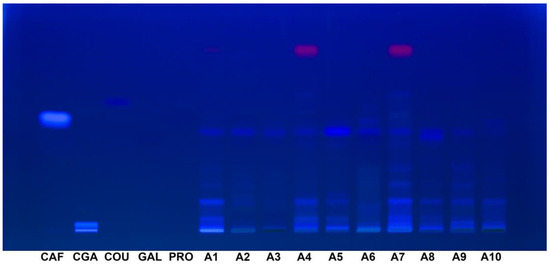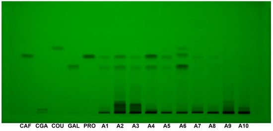 HPTLC fingerprint (365 nm, without derivatization) for Acer (A1–A10) samples and phenolic acid reference bands. For A4 and A7 samples, the red bands that appear in the solvent front are due to chlorophyll content. CAF: caffeic acid; CGA: chlorogenic acid; COU: p-Coumaric acid; GAL: gallic acid; PRO: protocatechuic acid.