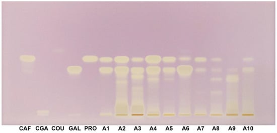 HPTLC–DPPH fingerprint (white light) for Acer (A1–A10) samples and phenolic acids reference bands. CAF: caffeic acid; CGA: chlorogenic acid; COU: p-Coumaric acid; GAL: gallic acid; PRO: protocatechuic acid.