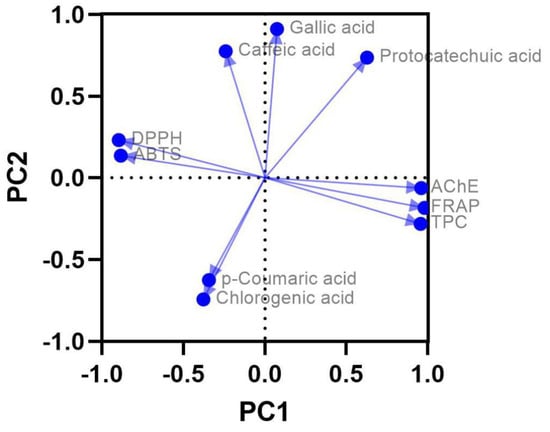 In the PCA plot, gallic acid, caffeic acid, and protocatechuic acid are positioned positively along the first principal component (PC1), which is closely aligned with AChE inhibitory, FRAP, and TPC assays. This grouping suggests that these compounds contribute to the activities associated with this axis. However, when examining the Pearson’s correlation for gallic acid and TPC, the value is weakly negative (r = −0.154, p = 0.67), indicating that gallic acid’s contribution to TPC is either negligible or slightly antagonistic. This apparent contradiction can be explained by the overall complexity of interactions among the phenolic compounds and other bioactive constituents, as the PCA represents collective variance rather than individual direct correlations.