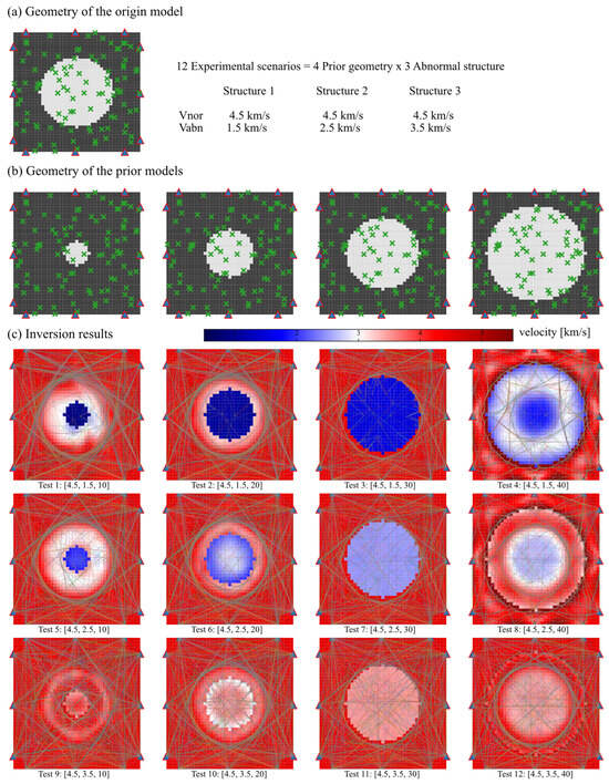 The above analysis was based on the following assumptions: (1) We know there are abnormal areas. (2) We know the wave velocity of the abnormal area (the wave velocities of the abnormal area in the original and prior models are the same). (3) We do not know the exact range of the abnormal area. Moreover, in practical engineering, we do not know whether or not there are abnormal areas or what the wave velocity of rocks in abnormal areas is, let alone the rough geometry of abnormal areas. Therefore, we included the following tests in our method.