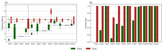 The inverted velocity distribution within the actual range of the normal and abnormal areas (a) and the correct rate in each test (b).