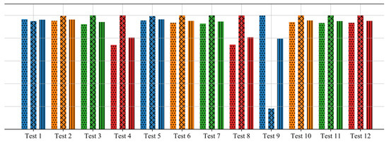 The correct rates of the recognized boundary for the 12 tests. The dots, cross-hatching, and vertical hatching indicate the recognition performance for the normal area (), abnormal area (), and total (), respectively.