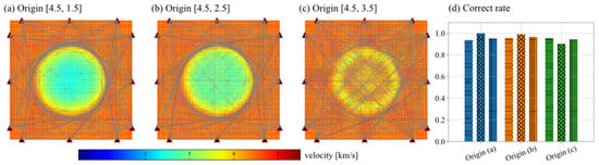 The shape of the original model is the same as in Figure 3a, and the event and sensor locations are consistent with previous tests. The wave velocities in the origin anomalous area are settled as 1.5 km/s, 2.5 km/s, and 3.5 km/s, respectively. However, the prior model is completely homogeneous as we do not know if an abnormal area is present. The results are shown in Figure 6.