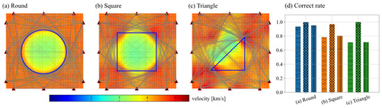 As shown in Figure 7, the inversion accuracy of the velocity field gradually decreases from the circle to the square and triangle. From the ray distribution and intersection points, the identified boundary of the circular void is the clearest. Only an approximate boundary can be recognized when a rectangular anomalous area forms, for which the identified boundary accuracy rate is only 80%. In the case of the triangular anomalous area, there is a large error in the recognized boundary, and the overall accuracy rate is only 70%. That is, the rounder the abnormal area, the easier it is to identify the boundary, and the more angular the shape, the harder it is to describe clearly.