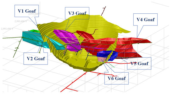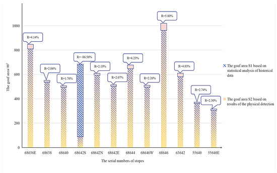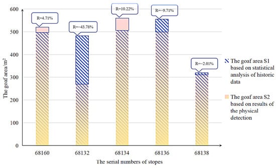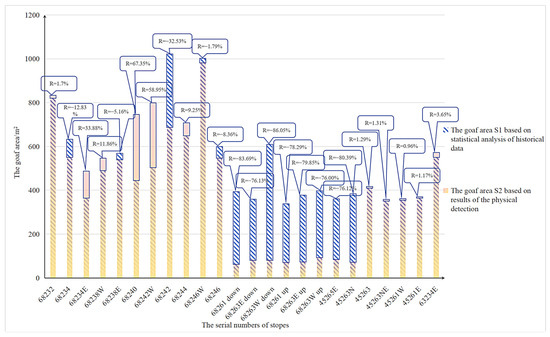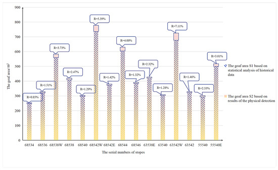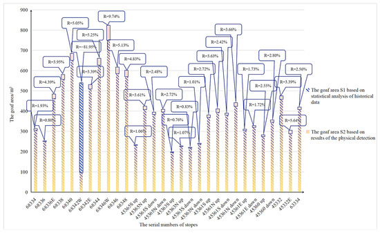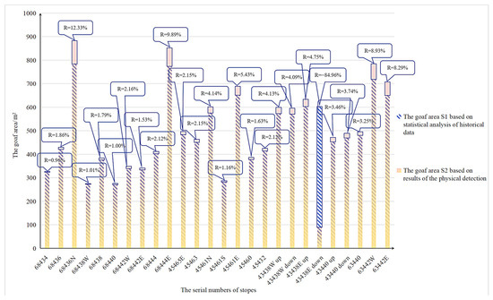 Goaf area of different stopes derived from the statistical analysis of historical data and physical detection, with comparative analysis of results.