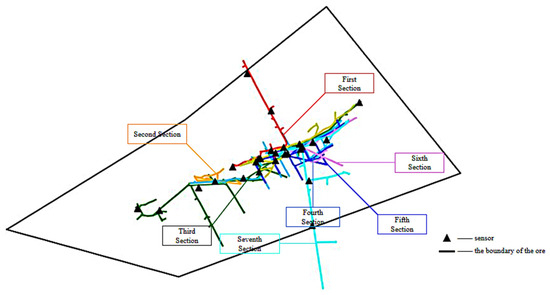 The layout plan of sensor deployment. The sensors are denoted by black triangles, the ore body boundary is denoted by black solid lines, and the main tunnels and operational areas of the mine are denoted by the other colored solid lines.
