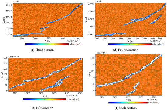 After obtaining the arrival times of seismic waves from the sensors, noise signals are identified and removed by comparing their waveforms with those of various noise sources. Based on the characteristics of downhole noise sources and their waveforms, noise signals such as drilling impact, blasting vibrations, and electrical interference are accurately recognized and eliminated, thereby improving the quality of the signal set. The target area was divided into a grid, with 5 m × 5 m grids filling six section planes. Based on the parameter settings from Section 3’s synthetic experiment and the specific conditions of the target area, the maximum number of iterations, the residual tolerance to ceasing iteration, and the quasi-Newton step size are set to 20, 1 × 106, and 1.0, respectively. The standard deviations on and are 0.1. The standard deviations on , , and are 0.2. The correlation length is 5. Using the goafs’ area and location based on the statistical analysis of historical data as the prior models, the P-wave arrival time data collected from monitoring were used to invert the velocity field for each plane, following the method described in Section 2.