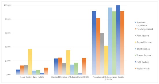 To verify and ensure the accuracy and reliability of the detection results, we calculated the relative error values by comparing the detection results of the goaf from synthetic and field experiments with their respective prior models. We further obtained the mean relative error, standard deviation of relative error, and the percentage of high-accuracy results (relative error < 10%), and plotted the distributions of these metrics across the synthetic experiment and field experiment (as shown in Figure 17).