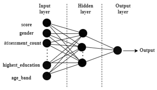 As per Figure 1, the input, hidden, and output layers make up the architecture of the ANN model. In our case study with the OULA dataset, the input layer consisted of 14 variables, capturing a diverse range of features relevant to the analysis. As a link between the input and output layers, the hidden layer was made up of neurons, each utilizing the ReLU (Rectified Linear Unit) activation function to perform computations to find hidden patterns in the data. The final result of these computations based on the examined data was displayed in the output layer. It consisted of a single neuron that uses a sigmoid activation function, making it suitable for binary classification tasks.