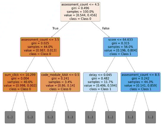 A visualization of the top portion of the DT model, focusing on the most significant features and splits due to space constraints. Based on this approach, “assessment_count” emerges as the most important feature in the model.