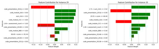 The LIME approach was used to give the model predictions’ interpretability after the ANN model was applied to the dataset. With LIME, we can deconstruct this model’s intricate decision-making process and gain an understanding of the separate roles that each feature plays in generating a forecast. We may assess how various factors affect the model outputs and gain a better understanding of the reasoning behind the predictions by concentrating on specific students, like Students 29–30. By outlining the relative significance of various features in predicting the class, LIME helps to make these opaque models clearer, as demonstrated by the accompanying visualizations. As seen in the visualization for Students 29–30 (see Figure 4), the LIME approach was used to explain the predictions produced by the ANN model. Green bars signify positive contributions that support the outcome (PASS), and red bars signify negative contributions that contradict the result (FAIL). The plot features are displayed along the y-axis. For example, the feature code_presentation_2014J ≤ 0.00 for Student 29 has a significant negative contribution, which contradicts the PASS result. However, features such as code_module_CCC ≤ 0.00 and sum_click > 3.52 strongly support the PASS result.