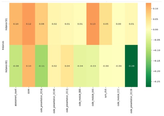 The SHAP method was applied to make the model predictions and understand the individual roles that each feature plays in producing the predictions. By analyzing specific students, such as Students 501 and 801, we evaluated how different factors influence the model’s outputs and gain deeper insights into the logic behind the predictions. SHAP highlights the relative importance of features in determining the predicted class, as demonstrated by the accompanying heatmap visualization. SHAP was used to explain the model’s predictions such as Students 501’s and 801’s visualization (see Figure 5). Green shades show negative contributions that contradict the result, whereas orange shades show positive contributions that support the outcome. For instance, the feature code_presentation_2013B significantly contributed negatively (−0.28) to the result for Student 801. Conversely, attributes like score have a positive impact and support the forecast.