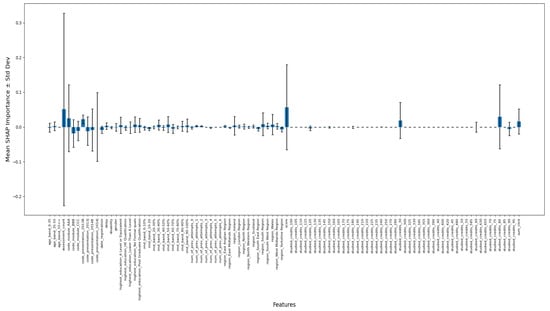 Figure 6 and Figure 7 present the total feature importance produced by LIME and SHAP for the different features in the dataset. Every bar depicts the average importance of a feature, while the error bars show the standard deviation, which reflects the variations in significance among the various dataset occurrences. Positive values show a positive contribution from the feature to the model’s predictions, whereas negative values imply a negative contribution. The distribution of the error bars illustrates how each characteristic is constantly given a certain priority by explanation techniques. Larger error bars on features show more variation, suggesting that their impact is more instance-specific or variable between model runs. The comparatively narrow error bars and significant mean values show that certain features are clearly highly important and show this consistently across several runs. Features like “score”, “sum_click”, and “assessment_count”, for example, display a strong positive mean with a small standard deviation. These features exhibit a consistent and significant contribution to the model’s forecasts. These visualizations aid in determining which features are most important in influencing model predictions, and they also illustrate the positive effects and negative aspects of each individual feature in the predictive model.