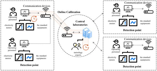 Advanced technology called remote calibration combines electricity meters, smart detection systems, and computer technologies to make calibration processes much more accurate and efficient [,]. As illustrated in Figure 1, a remote calibration system is built on three key components: the central laboratory, the detection point, and reliable internet connectivity. Standard equipment and metering devices at the detection point collect data and perform calibration tasks. Concurrently, experts at the central laboratory remotely monitor the calibration process through internet-based systems, offer real-time guidance, and issue calibration certificates. Compared to traditional on-site calibration, which required metrologists to perform operations in person, remote calibration enhances personnel efficiency through improved task management and record-keeping while also streamlining the transportation process. This area requires further research and technological development to enable remote calibration, meeting the increasing demand for calibrating various electricity measuring devices.