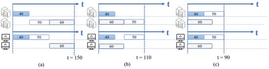In order to optimize the use of the client and expert side and improve efficiency, our primary objective is to minimize the maximum completion time, which indicates the moment when all tasks are finished. As shown in Figure 3, the execution sequence of tasks can significantly impact the overall performance, as demonstrated in Figure 3a,b. Moreover, different allocation strategies lead to varying results, as depicted in Figure 3b,c. The optimal scheduling strategy is illustrated in Figure 3c, achieving a maximum completion time of 90.