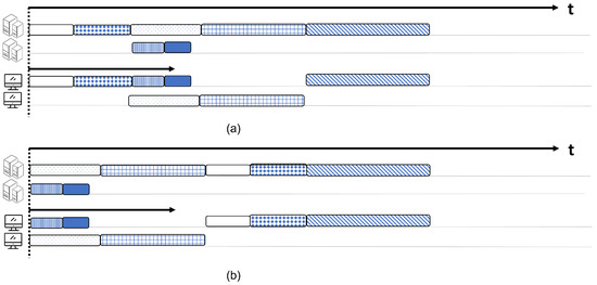 Comparison of Scheduling Policies with the Same Minimum Completion Time: (a) schedule with higher average completion time, and (b) schedule with lower average completion time.