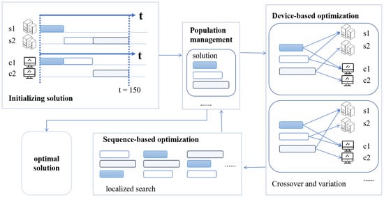 The HGA begins by generating an initial solution and subsequently creates multiple populations, as populations M, derived from this initial solution. It then iteratively applies device-based and sequence-based optimizations to refine and update the population, aiming to identify the optimal solution. The algorithm framework is illustrated in Figure 5.