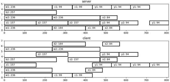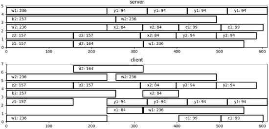 A comprehensive evaluation and detailed analysis were conducted to assess the overall performance of the hybrid genetic algorithm. Figure 6 and Figure 7 depict the visualization results of synchronous task scheduling. Different symbols in the figures represent various task types, with the numbers following the symbols indicating task generation checkpoints and the numbers after the colons denoting task execution times. The x-axis shows the start and completion times of task execution, while the y-axis represents the servers and clients to which the tasks are assigned. The figures illustrate that tasks are executed synchronously across all servers and clients, with consistent start and completion times.