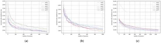 To assess the impact of the number of tasks on the maximum task completion time, we kept all parameters constant except for the number of tasks. These tasks were randomly generated, with specific quantities defined as follows: for small-scale task scenarios, the quantities were set at [10, 20, 30, 40, 50]; for medium-scale scenarios, the quantities were [20, 40, 60, 80, 100]; and for large-scale scenarios, the quantities were [60, 120, 180, 240, 300]. After conducting multiple simulation experiments, the results for the small-scale experiments are presented in Figure 9a, for the medium-scale experiments in Figure 9b, and for the large-scale experiments in Figure 9c.