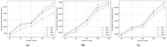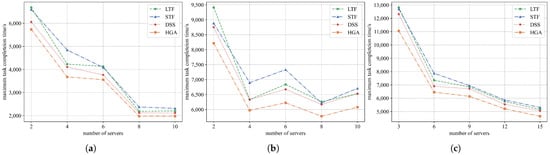 To further evaluate the performance of the parameters affecting the Hybrid Genetic Algorithm (HGA), we conducted experiments by varying the number of tasks, servers, and clients. The outcomes were compared against those obtained using the Longest Task First (LTF) algorithm, the Shortest Task First (STF) algorithm, and the Dynamic Synchronous Scheduling (DSS) algorithm, all of which are designed for synchronous scheduling scenarios. Each experiment was averaged over multiple runs to ensure reliability. The key performance metric used was the maximum completion time of the scheduling strategies derived by the algorithms. A shorter maximum completion time indicates a more efficient scheduling strategy and, consequently, better algorithm performance.