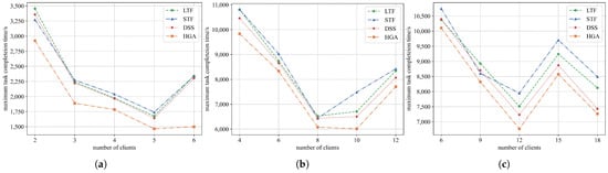 Finally, we assess the impact of the number of clients on the maximum task completion time. Similar to the previous section, we kept the number of task types constant at 10, and all other parameters, except for the number of clients, were set as shown in Table 2. The number of clients varied across different scenarios. In the small-scale scenario, the total number of clients was set to 2, 3, 4, 5, and 6. In the medium-scale scenario, the total number of clients was set to 4, 6, 8, 10, and 12. In the large-scale scenario, the total number of clients was adjusted to 6, 9, 12, 15, and 18. Figure 11a–c illustrate the impact of the number of clients on the maximum task completion time under three different scale scenarios.