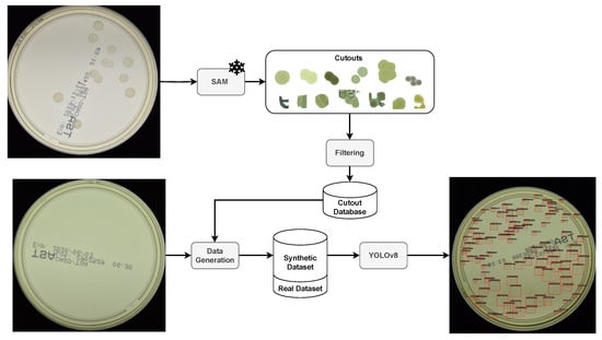 Overview of the proposed pipeline. First, colonies are segmented using a pre-trained and frozen Segment Anything Model [15]. Next, poor segmentations are filtered out to avoid introducing artifacts into the synthetic images. The segmented colonies are then inserted onto new, empty agar plates. Finally, YOLOv8 [48] is pre-trained on the synthetic data and fine-tuned on real data to achieve optimal accuracy.