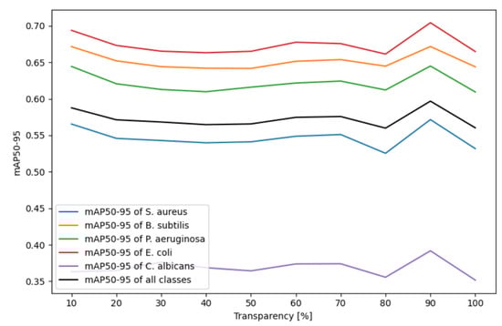 An experiment was conducted to see which transparency value saw the most improvement while training the neural network. For this, images were generated with a set transparency value for all colonies. Ten different values were tested at an interval of 10%, ranging from 10% to 100%. Figure 4 presents the mAP values for all the classes in the dataset following the fine-tuning of these pre-trained models with real images. The figure shows that a transparency value of 90% gives the best results.