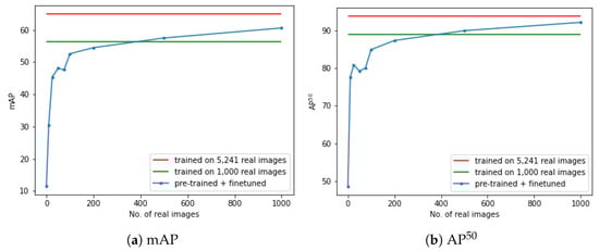 When fine-tuning on just 10 real images, the model achieved a significant boost with an AP50 of and mAP of , representing improvements of and , respectively, compared to the model trained solely on synthetic data. Fine-tuning with 25 real images further improved performance, yielding an AP50 of and mAP of , with a notable increase in mAP compared to the 10-image model. This suggests that additional real data enhance detection accuracy, particularly at higher IoU thresholds. However, fine-tuning with 50 real images showed a slight decline in AP50 (), though the mAP continued to improve, indicating better generalization across IoU thresholds. Adding more images did not always lead to proportional gains. The model fine-tuned with 75 images showed no significant overall improvement, and its AP50 fell behind the 25-image model. However, using 100 real images resulted in a marked improvement, reaching an AP50 of and mAP of , approaching the performance of the model trained on exclusively 1000 real images, with a small accuracy gap of only in AP50 and in mAP. Fine-tuning with 200 images brought further gains, achieving AP50 and mAP, closing the gap to the 1000-image model by in both metrics. Finally, the model fine-tuned with 500 images reached an AP50 of and an mAP of , surpassing the model trained on 1000 real images, albeit by a small margin that can be attributed to variations in the dataset. These results demonstrate that 500 real images are sufficient to fine-tune a model pre-trained on synthetic data, achieving near-parity with models trained on larger real datasets.