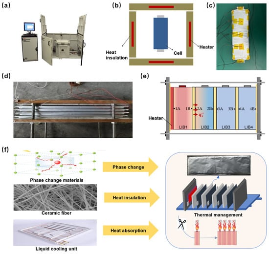 (a) Accelerating rate calorimeter (ARC); (b) schematic diagram of the single cell arrangement method used in the test; (c) battery image before test; (d) TR propagation test device; (e) schematic diagram of thermocouple arrangement; (f) schematic diagram of the overall principle and arrangement of the experiment.