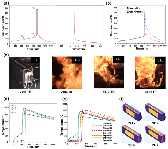 (a) The center temperature of the cell in the ARC experiment; (b) comparison of simulation and experimental results of ARC experiment; (c) battery module TR propagation process; (d) TR temperature of battery module with different insulation layers; (e) comparison of simulation and experimental results of TR propagation experiment; (f) the dynamic image of TR simulation.