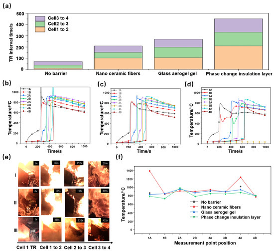 (a) Cell-to-cell TR propagation time; (b) TR temperature rise diagram of battery module using nano-ceramic fiber insulation layer; (c) TR temperature rise diagram of battery module using glass aerogel insulation layer; (d) TR temperature rise diagram of battery module using phase change insulation layer; (e) TR propagation phenomenon using different insulation layers; (f) maximum temperature at each measuring point.