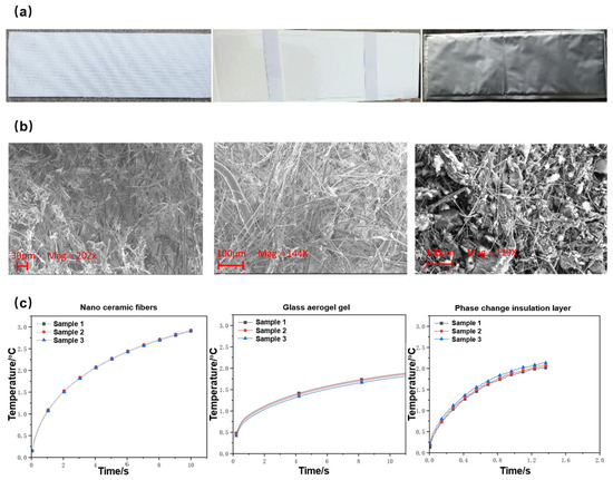 The physical images of the different thermal insulation materials are shown in Figure 4a, and the SEM images of the three materials are shown in Figure 4b. It can be seen from the SEM images that the diameter and thickness of the nano-ceramic fibers are different and that they have a crisscross distribution in space. The glass aerogels have dense fiber filaments, and they also fill a small amount of the aerogel particles between the fibers, which enhances their heat insulation ability. The composite phase change material has a large amount of liquid phase change and flame-retardant materials arranged between the nanofibers, which proves that it has a certain cooling and flame-retardant function when the TR occurs. The temperature–time relationship of the thermal diffusion of the different thermal insulation materials is shown in Figure 4c. The transient plane heat source method is used to measure thermal conductivity, and the thermal property parameters can be obtained using a mathematical model. The thermal conductivity in the thickness direction and the thermal diffusivity in the format direction of the composite phase change materials are superior to those of the other two materials, and it can be seen that the composite photo-materials have lower thermal conductivity in the vertical direction. The thermal diffusivity in the direction of the format is higher, which indicates its barrier performance for thermal diffusion between cells under TR conditions and its good heat dissipation performance under normal conditions.
