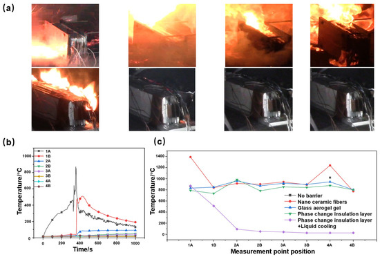 Figure 3e fully records the phenomenon that occurs when each cell in the battery module triggers TR. By observing the experimental phenomenon, it can be seen that when different insulation layers are used, the situation in which TR occurs in the first battery is different. In the nano-ceramic fiber insulation layer module and the glass fiber aerogel insulation layer module, when TR occurs, the locations of explosion and fire are located at different side poles; in the composite phase change material insulation layer battery module, a strong flame and a lot of smoke erupt from the bottom side of the first violent explosion, followed by the explosion of the other surfaces.