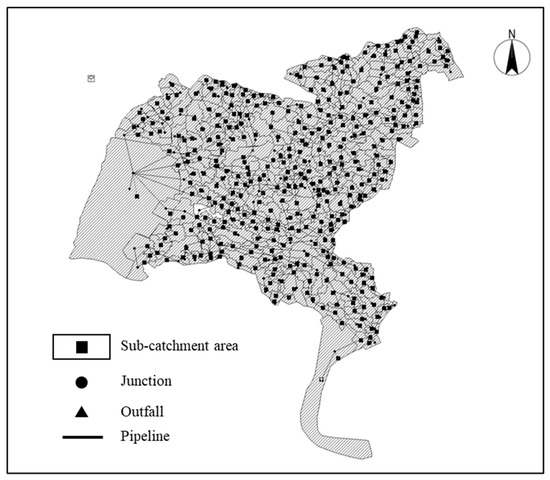 This study employed the ArcGis Thiessen polygon tools to partition the sub-catchment regions. Subsequently, the delineation of the sub-catchment regions pertaining to the target pipe sections was conducted based on criteria such as elevation, slope, pipe section relationships, and functional areas. A visual interpretation method divided the study area into five categories: rooftops, roads, green spaces, rivers, and undeveloped land. These categories accounted for 29.6%, 8.6%, 43.39%, 2.88%, and 15.53% of the total area, respectively. The infiltration rate is subject to influence by the type of land used. Under land use in the study area, green spaces and rivers are designated permeable surfaces, whereas roofs, roads, and unused land are classified as impervious surfaces. The proportion of land area occupied by green spaces and rivers in each sub-catchment is calculated as the ratio of permeable area in the corresponding sub-catchment. The percentage of land area occupied by roofs, roads, and unused land is determined by the ratio of impervious area in the corresponding sub-catchment. Subsequently, the characteristic parameters of the drainage network were obtained by reference to Changzhou City Flood Control Planning (2017–2035) and a field survey of Wujin District. The characteristic parameters of the nodes were primarily derived from the dataset of the flood control plan. In contrast, individual exploration and measurement were conducted for certain nodes in specific locations. The resulting SWMM is shown in Figure 3.