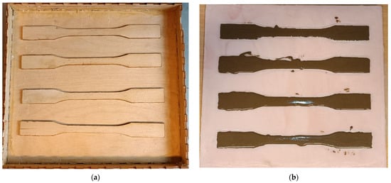 Preparation of the composite epoxy-resin–OSA composite samples: (a) plywood box with sample shapes for silicone molding; (b) composite epoxy-resin–OSA mixture poured into the silicone mold.