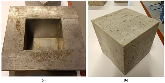 Preparation of the composite concrete–OSA samples: (a) molding shape for cubic sample preparation; (b) composite concrete–OSA testing specimen.